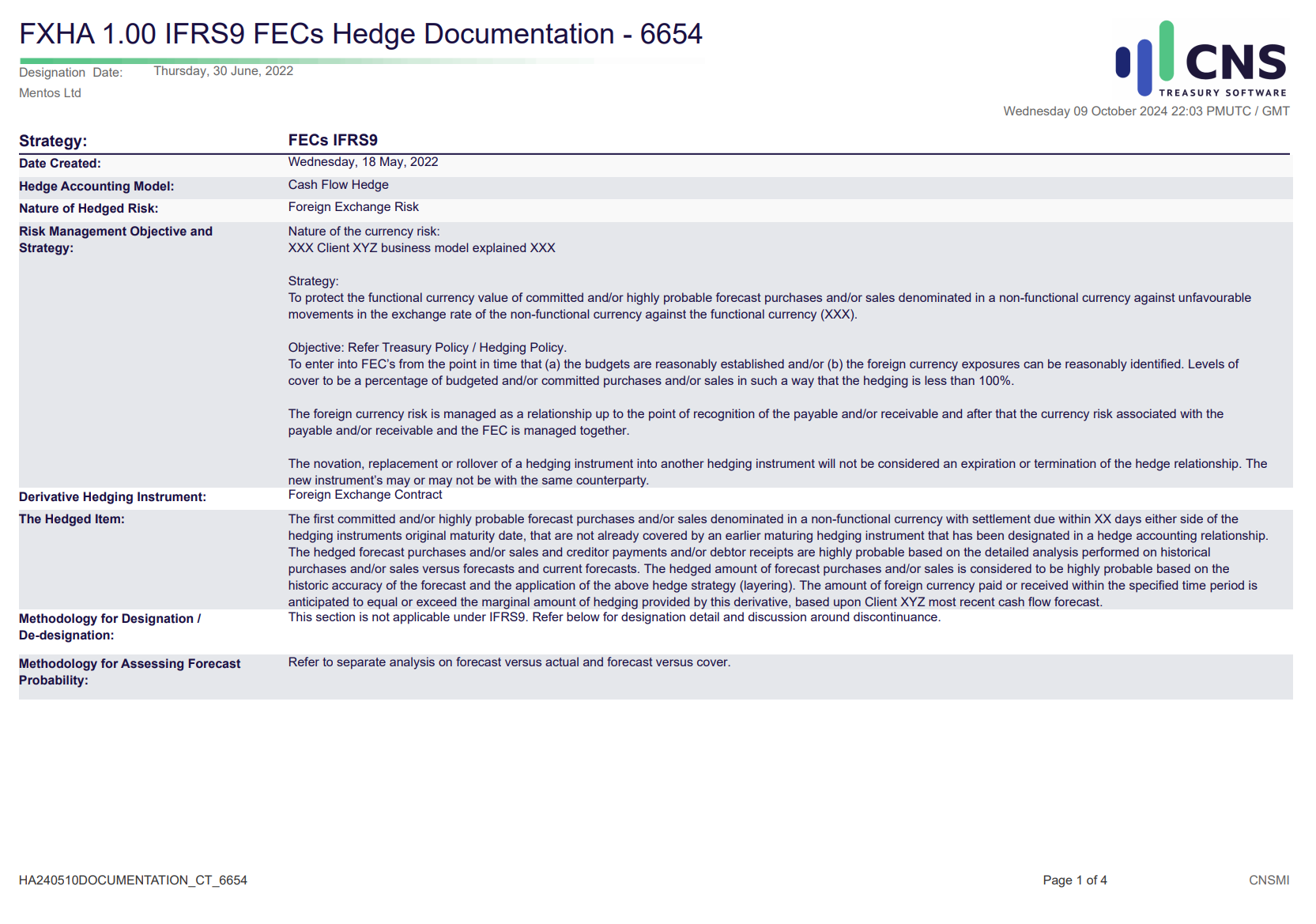 CNS Treasury’s Hedge Documentation feature ensures that all necessary information related to hedging activities is accurately recorded, stored, and easily accessible. This automated process creates comprehensive documentation for each hedge, including details such as hedge designation, risk management objectives, and the relationship between the hedging instrument and the hedged item. By automating hedge documentation, CNS Treasury helps treasury teams maintain compliance with IFRS9 and other regulatory requirements, while significantly reducing the administrative burden associated with manual documentation.